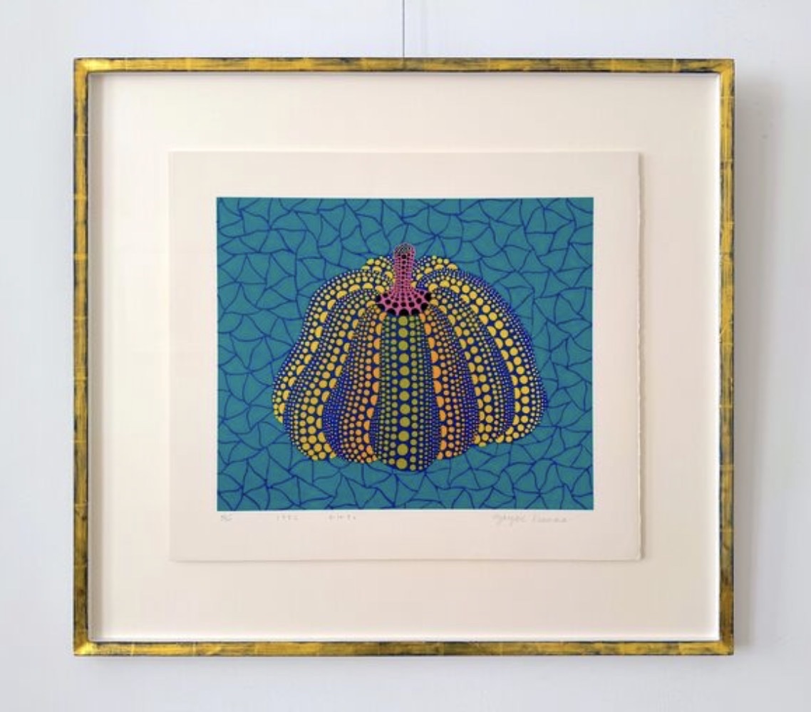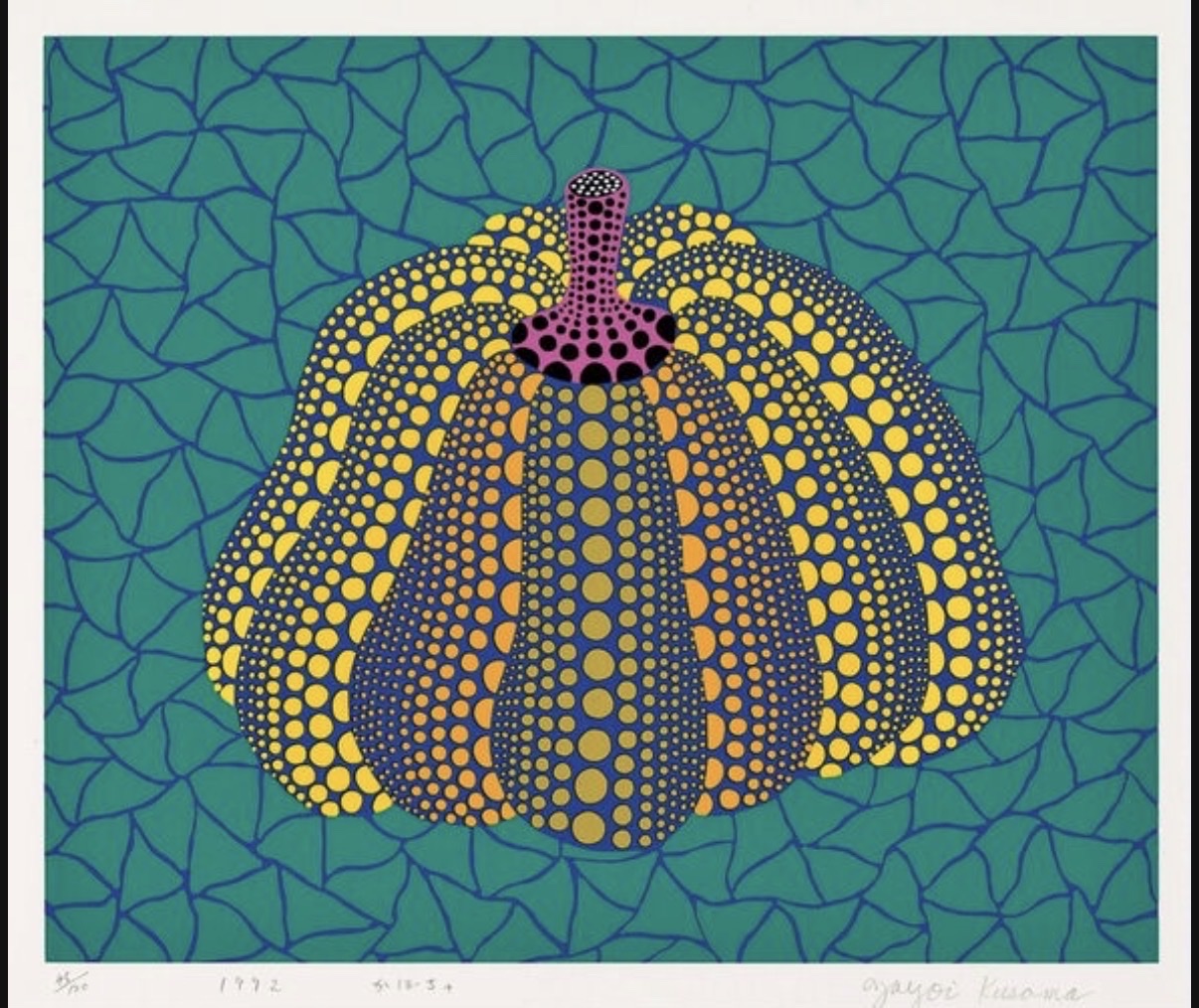 A vibrant and iconic screenprint by Yayoi Kusama depicting her signature pumpkin motif rendered in bold blues, yellows, oranges, and greens against a teal background with her characteristic all-over net pattern. The work is hand-signed, titled in Japanese ('かぼちゃ'), dated, and numbered in pencil on the recto. Numbered 45/120 from a limited edition of 120, this impression is in superb condition with full margins and deep, bright colors. Catalogued as no. 156 in the Yayoi Kusama Prints Catalogue Raisonné (1979–2017), this is one of Kusama's most sought-after print subjects.