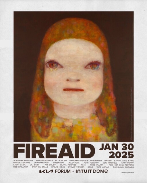 This FireAid poster from 2025 serves as a contemporary call to action for charitable relief efforts. The work demonstrates Nara's commitment to social causes through visual advocacy. The poster utilizes bold imagery and compelling design to engage viewers and encourage participation. It reflects the artist's ability to merge fine art with public service messaging. The piece stands as a modern example of art's role in community support and awareness.
