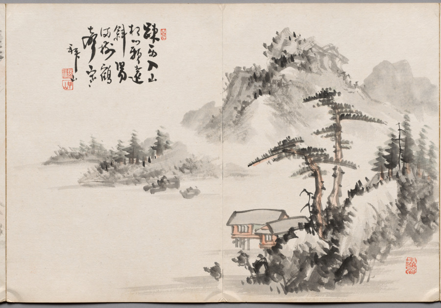 Opens the artistic journey of Haizan's complete album, establishing the visual and thematic elements that will unfold throughout the remaining spreads. Its position as the initial painting demonstrates careful consideration of the viewer's progressive experience through the work.