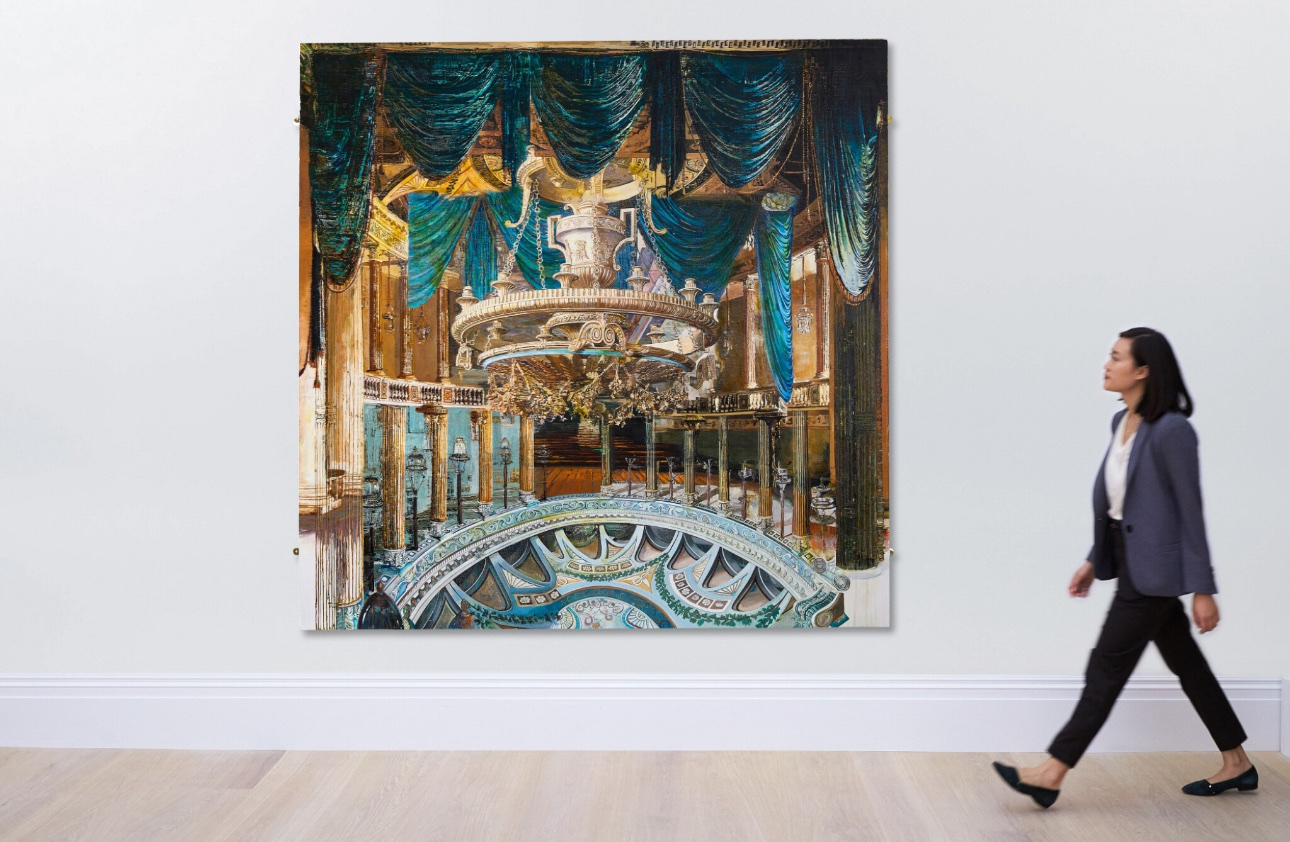 A monumental 200 × 200 cm oil on canvas by Chinese artist Yuan Yuan (b. 1973), depicting an ornate interior architectural space suffused with teal and gold drapery, a grand chandelier, classical columns, and intricate mosaic flooring. The work exemplifies Yuan Yuan's signature hyperrealist approach to decaying or opulent interiors, blurring the boundary between memory, fantasy, and ruin. Signed in Pinyin, titled in Chinese and Pinyin, and dated 2017 on the reverse. Sold at Sotheby's Hong Kong Contemporary Day Auction on March 30, 2026 for 320,000 HKD against an estimate of 250,000–450,000 HKD.