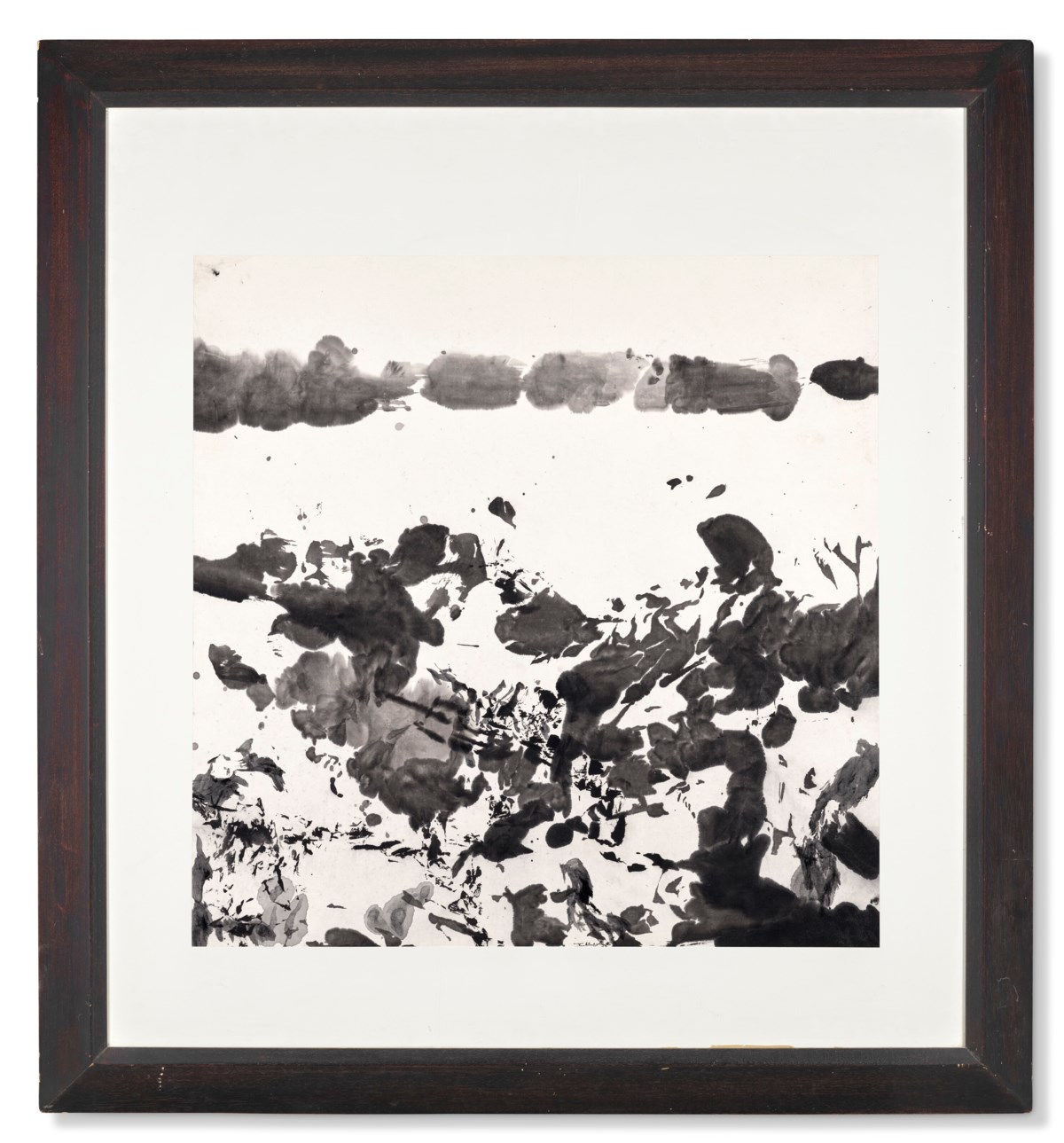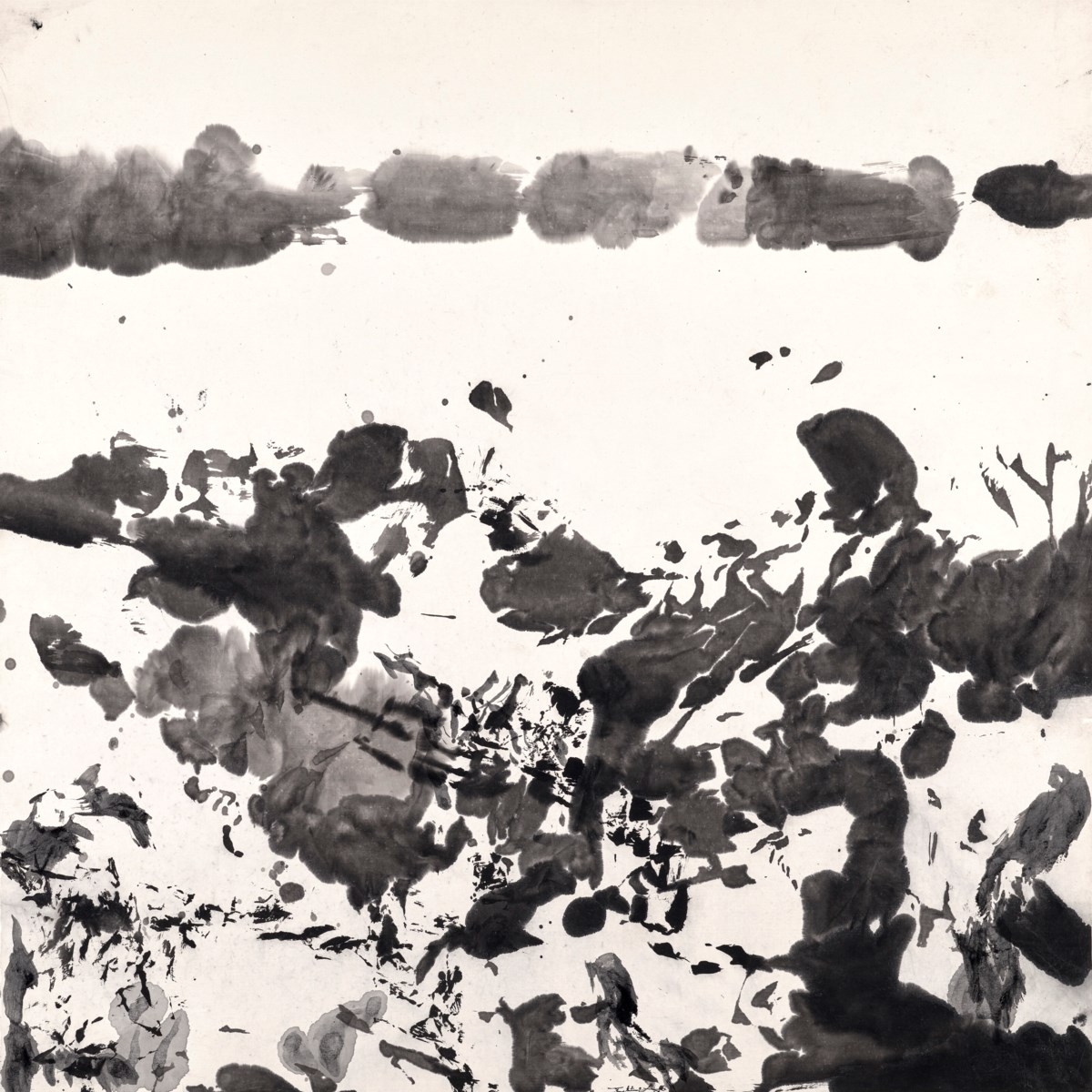 A dynamic composition of fluid ink and wash strokes that exemplifies Zao Wou-Ki's mastery of merging Eastern calligraphic tradition with Western abstract expressionism. Deep pools of ink dissolve into delicate washes, creating an atmospheric interplay of darkness and light across the paper's surface. The work evokes a sense of infinite space and natural energy, inviting the viewer into a meditative visual landscape that transcends cultural boundaries.