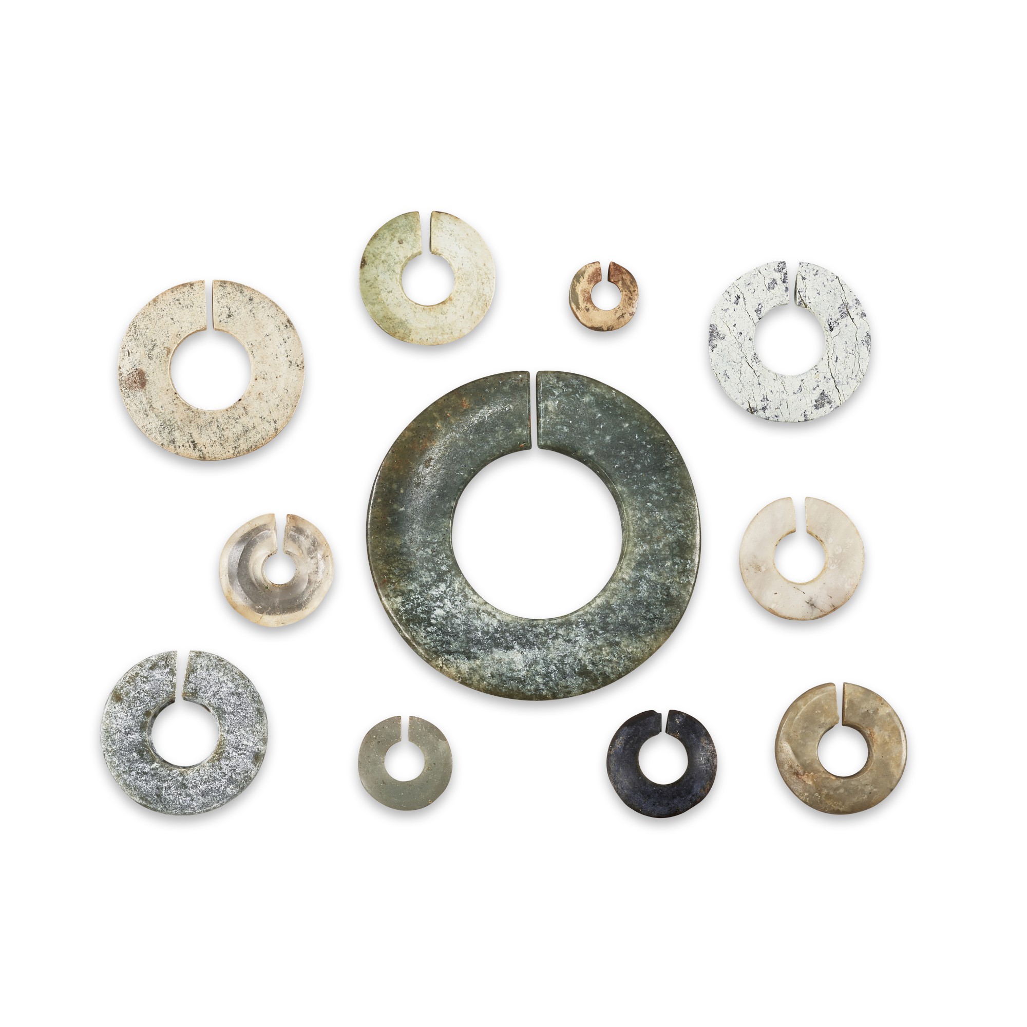 A group of 11 glass and hardstones slit rings, Vietnam, circa 3rd century 約三世紀 安南 各式玻璃及玉石玦一組十一件