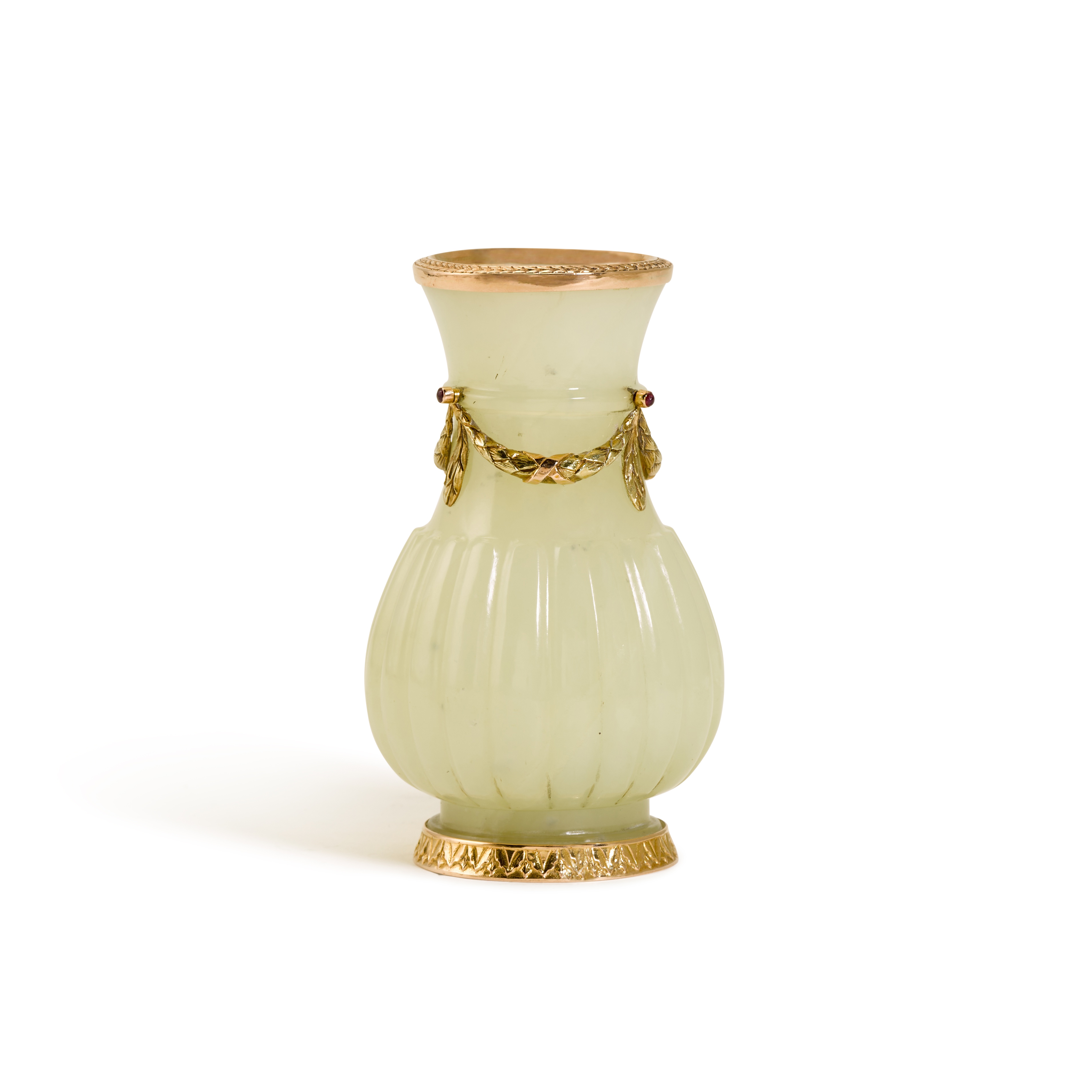 A Fabergé jewelled varicoloured gold-mounted bowenite bud vase, workmaster Michael Perkhin, St Petersburg, circa 1900