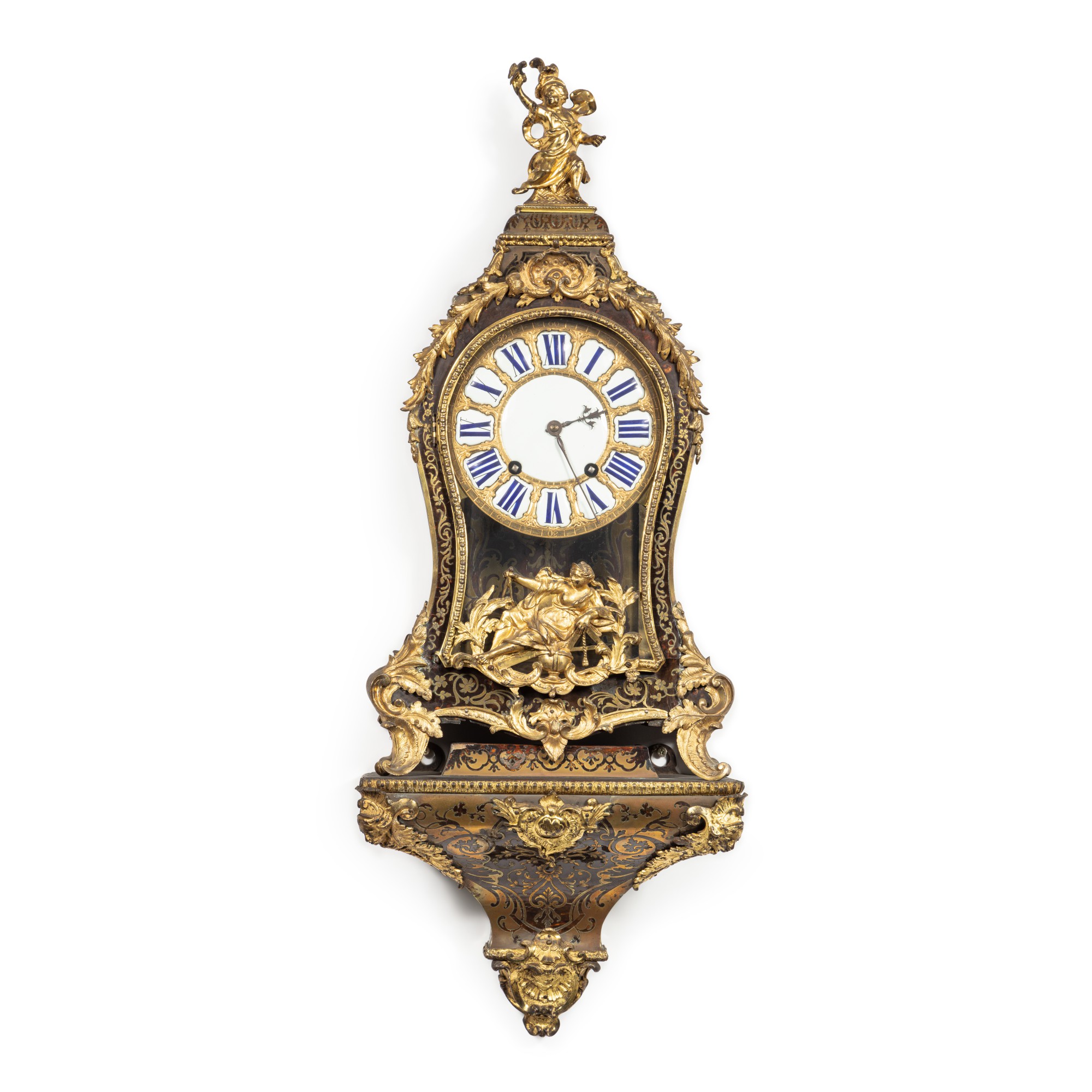 Cartel et sa console d'applique en marqueterie d'écaille et laiton et monture de bronze vernis d'époque Régence, vers 1720