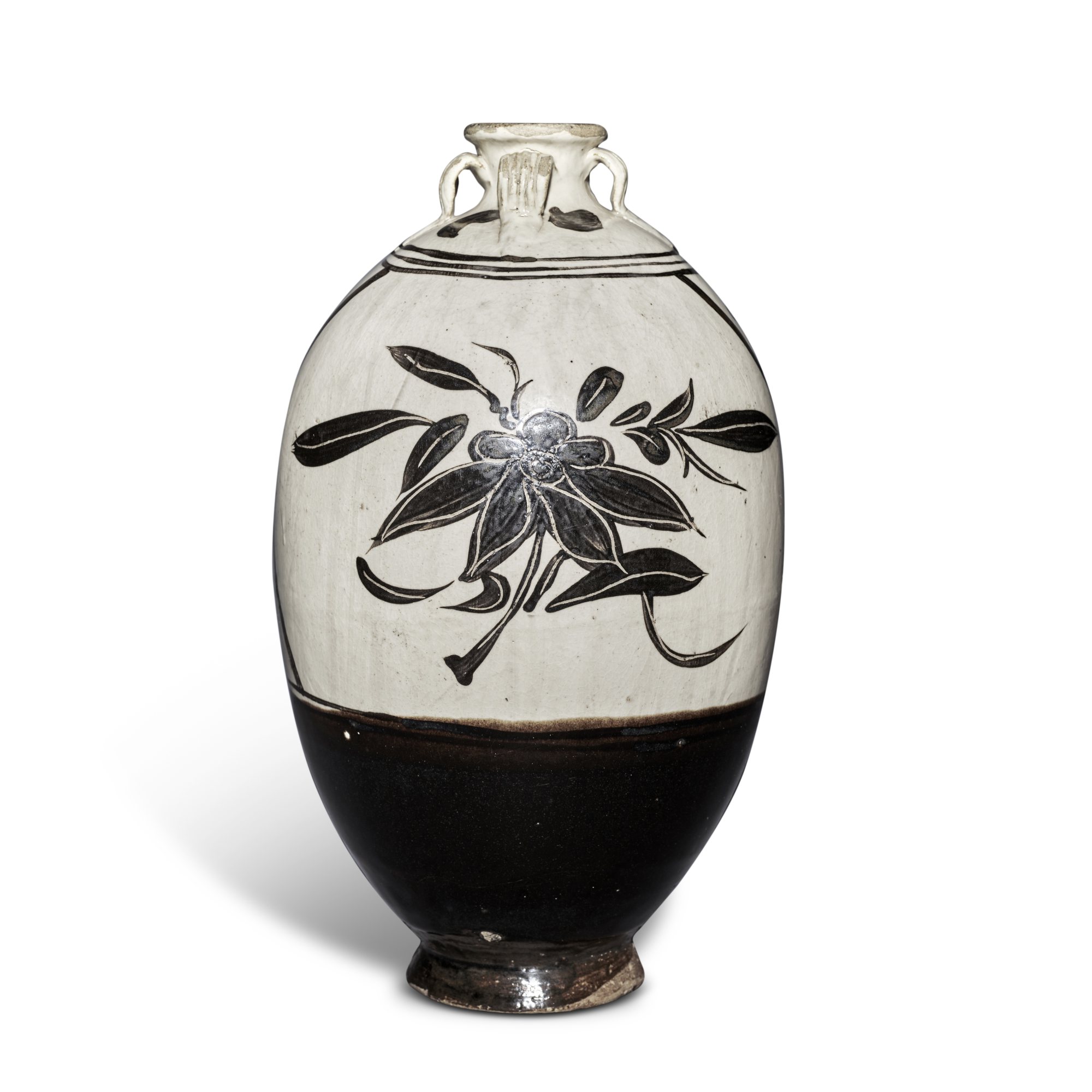 元至明 磁州窰白地黑花花卉紋四繫罐