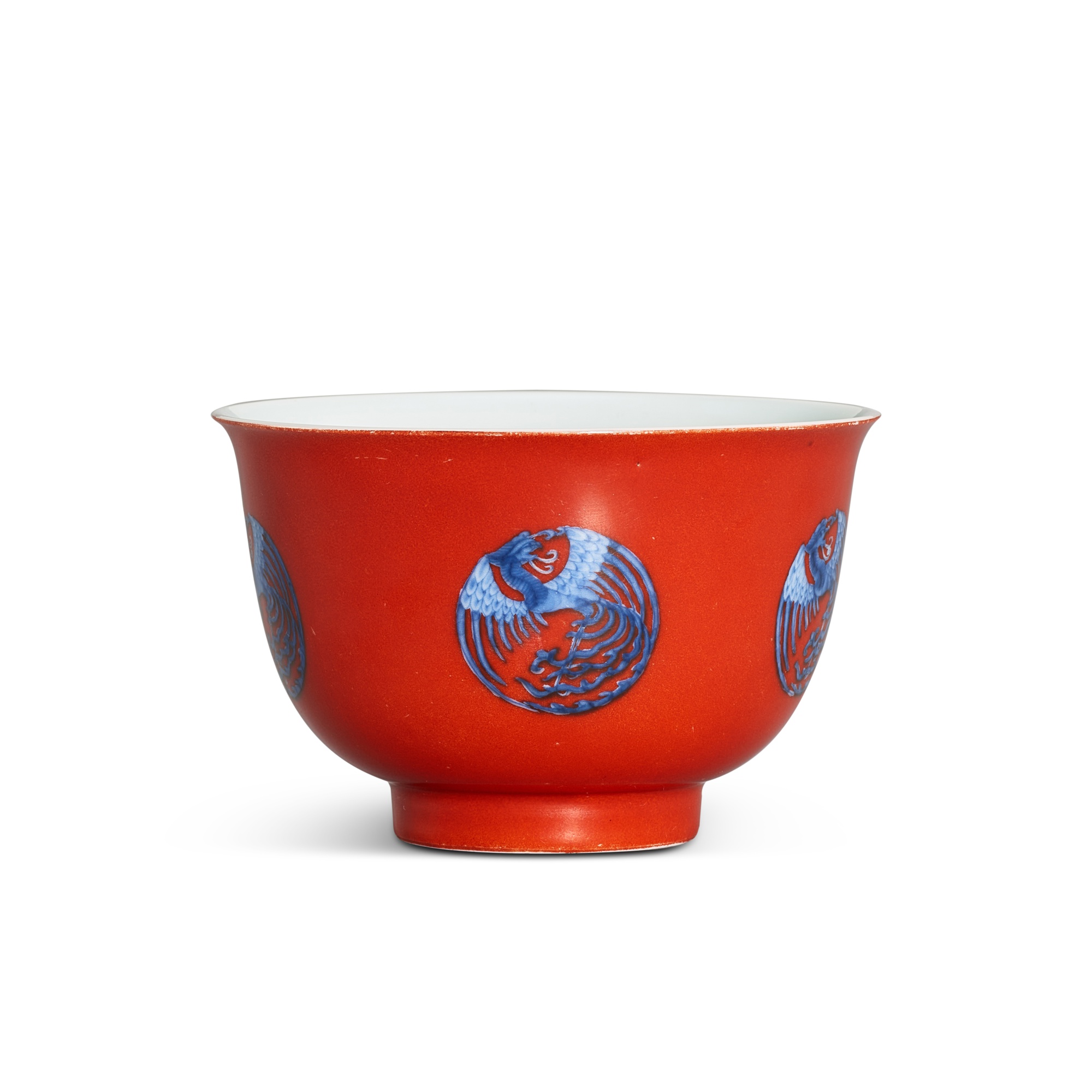 A coral-red ground underglaze-blue 'phoenix' bowl, Mark and period of Kangxi 清康熙 珊瑚紅地青花團鳳紋盌 《大清康熙年製》款