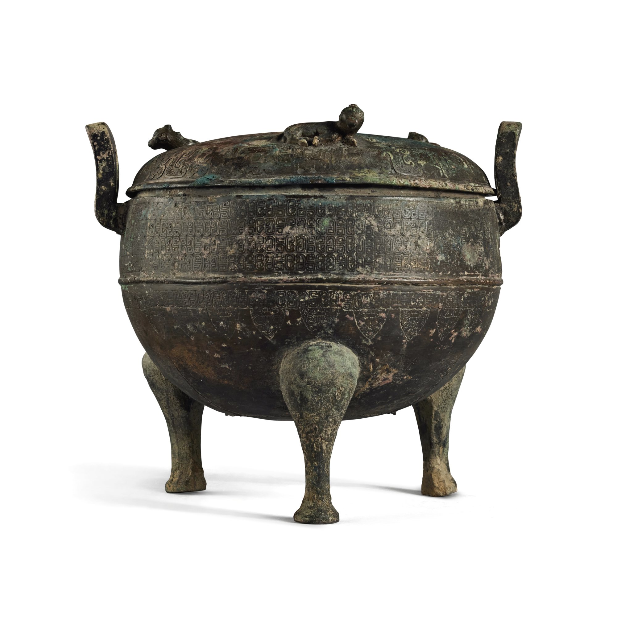 An archaic bronze ritual tripod vessel and cover (Ding)
