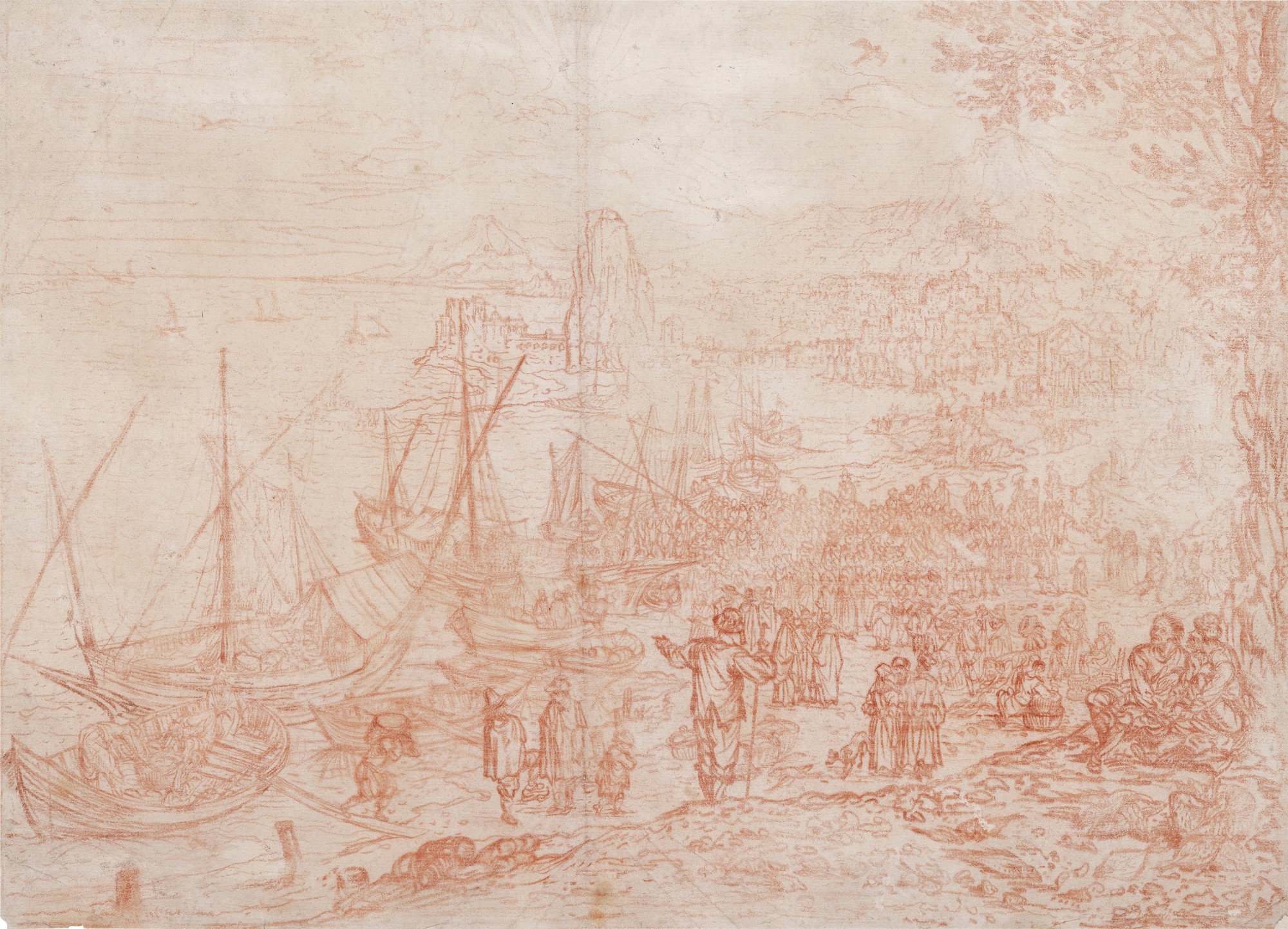 Recto: Various figure studies and groups, including a man with pigs on a leash and a group of women and children; Verso: River landscape
