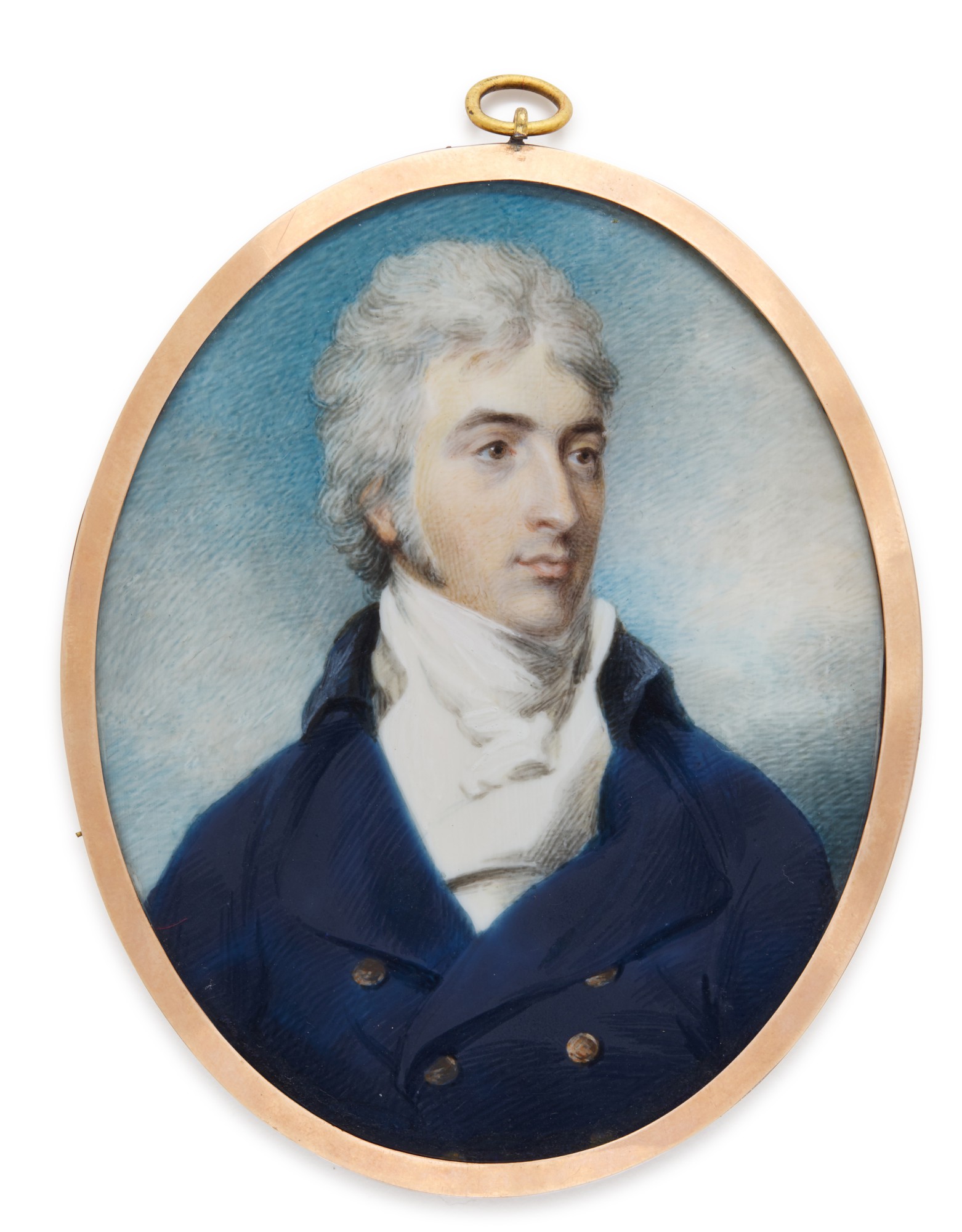 Portrait of a gentleman wearing a dark jacket and lace jabot with a blue ribbon