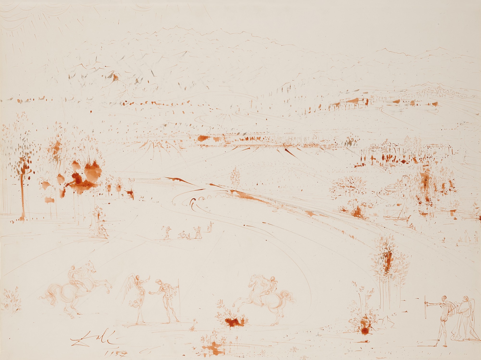 Vue de Toléde, ange, deux cavaliers et personnoges dans un paysage montagneux, 1957