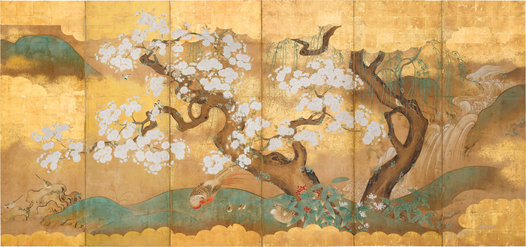 Pheasants under cherry trees and wisteria | Edo period, late 17th century