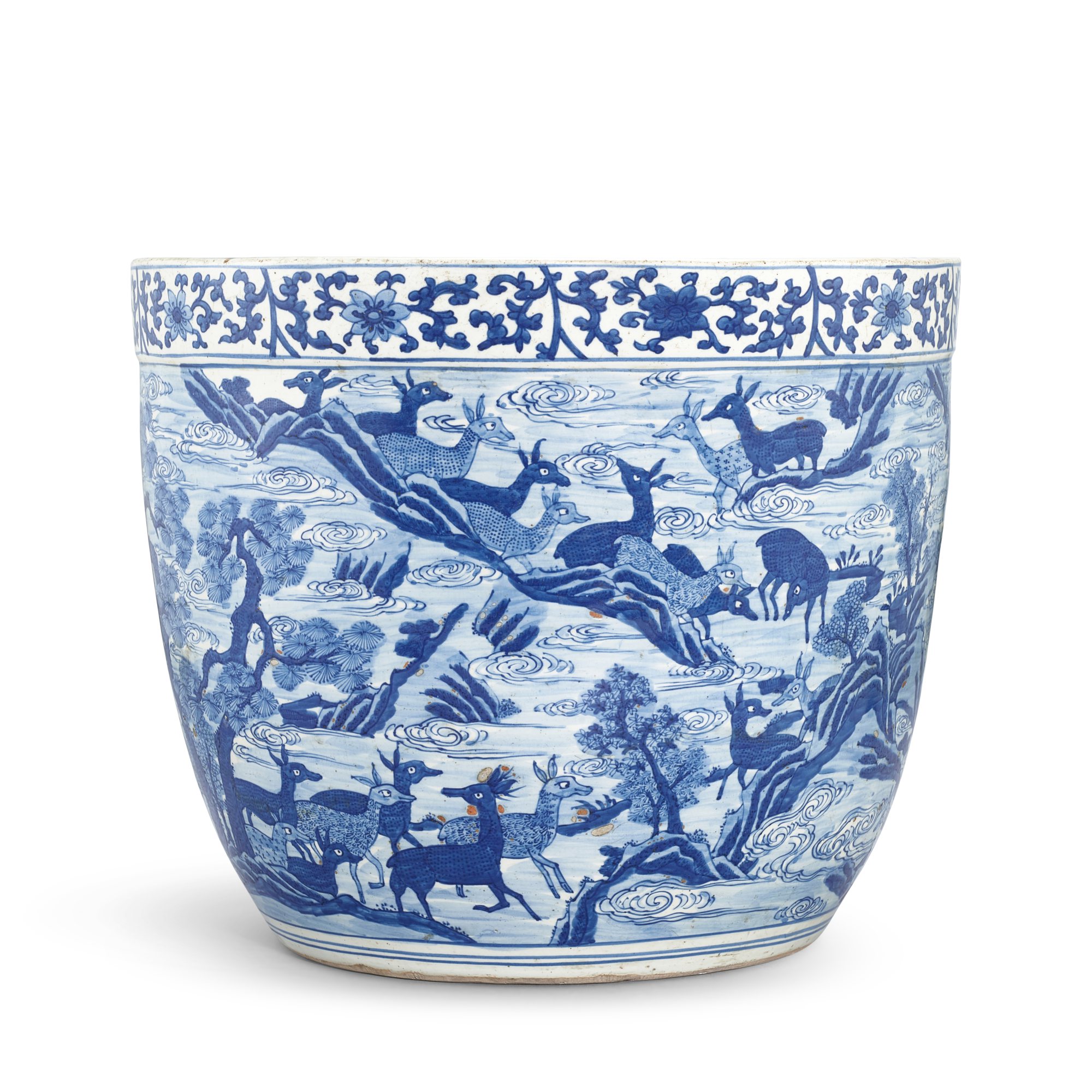 A large blue and white ‘hundred deer’ jardinière, Ming dynasty, Wanli period 明萬曆 青花百鹿缸