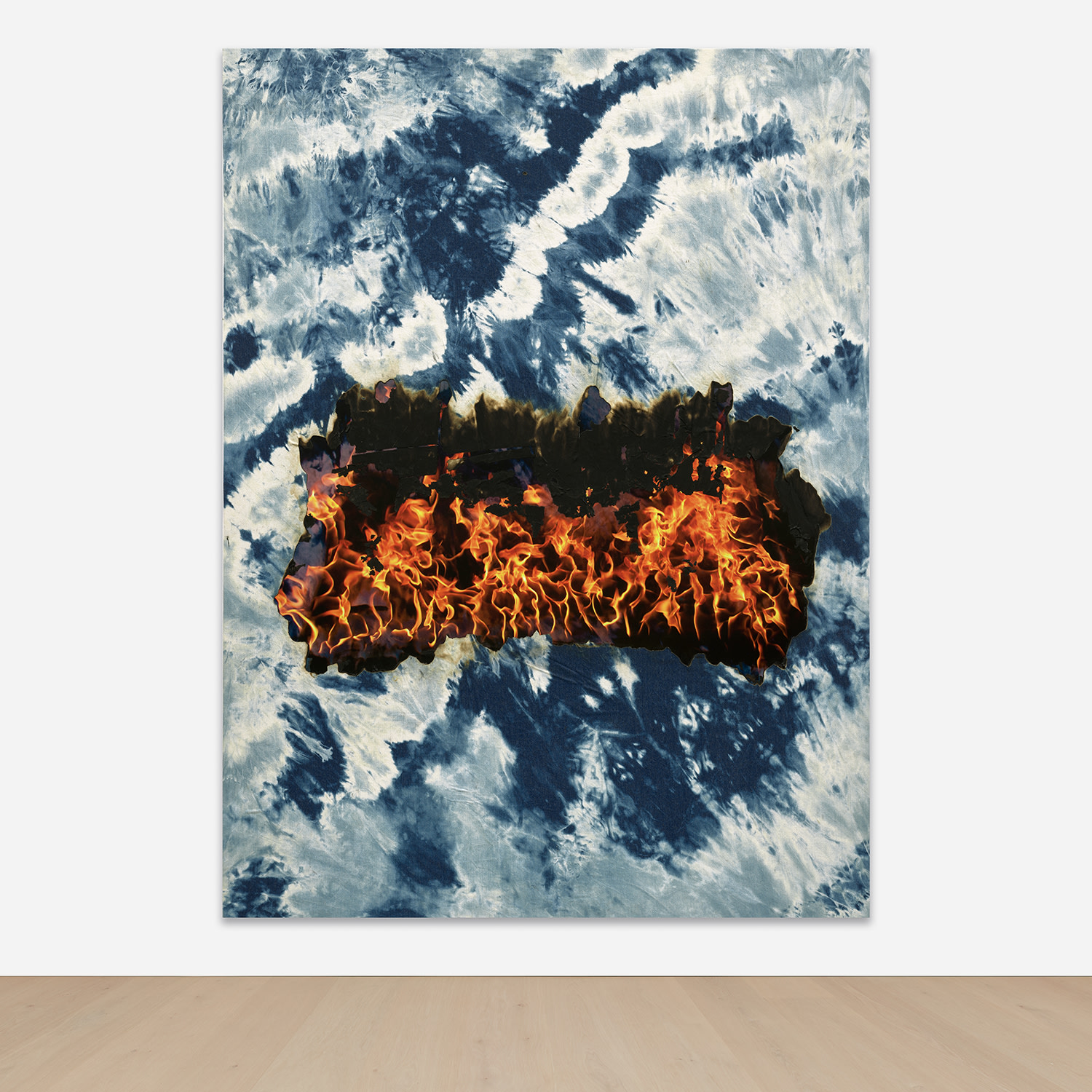 denim, bleach, laser print, fire and stretcher bars