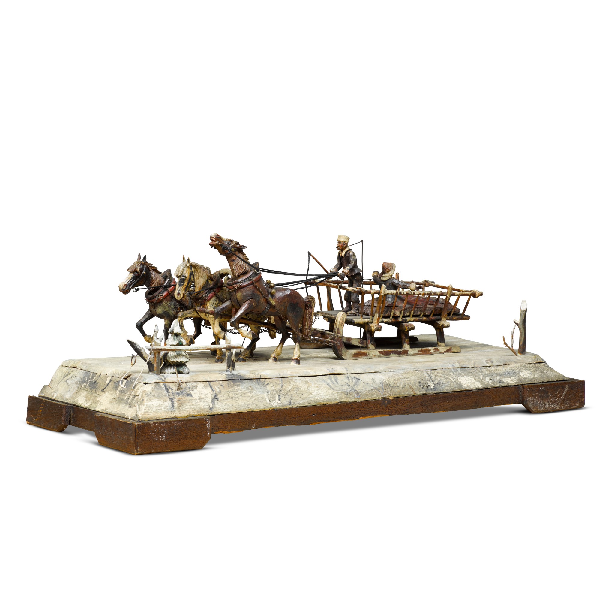 A troika musical automaton of a painted wood horse-drawn sled, Russia, late 19th / early 20th century