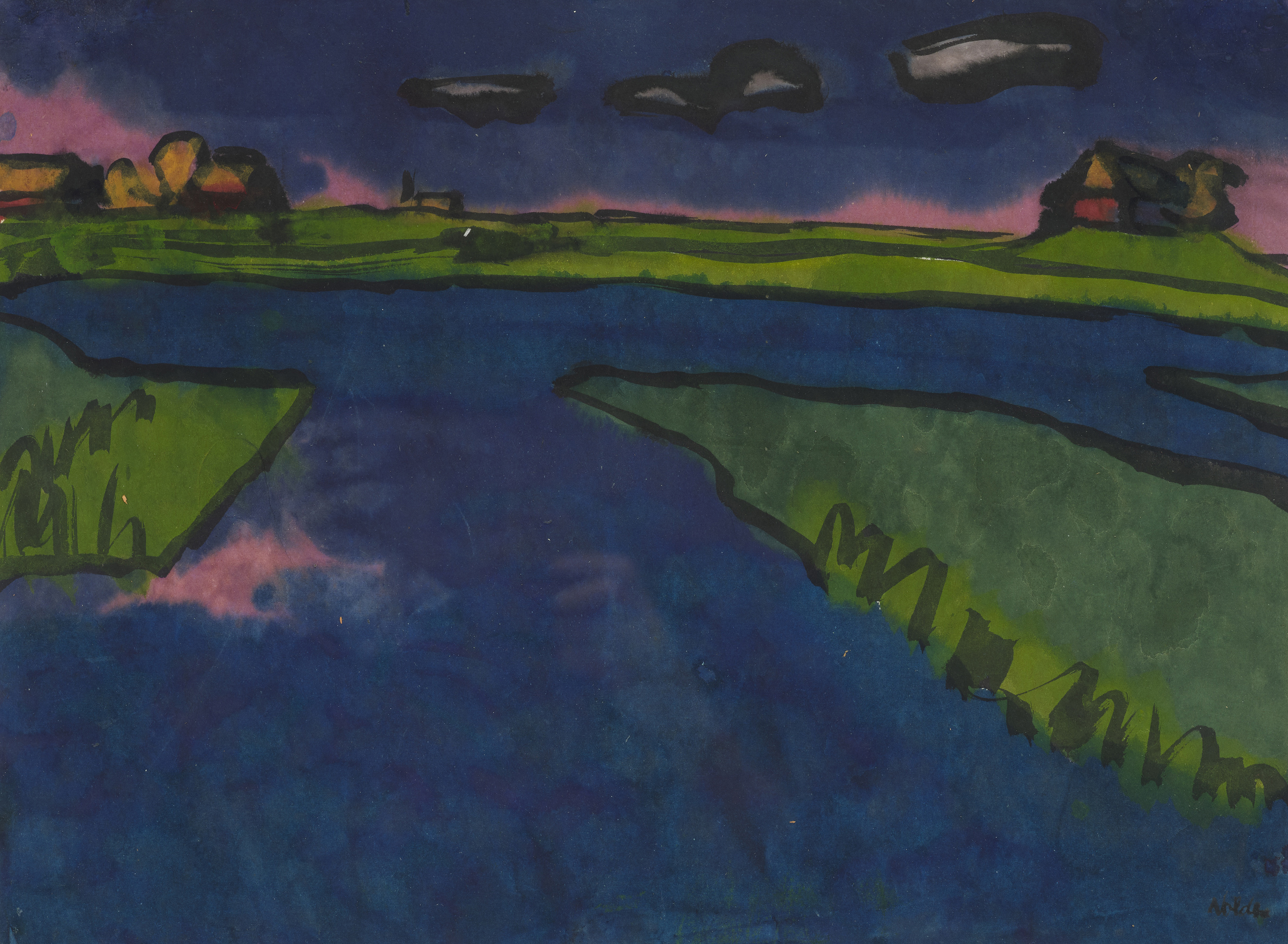 Marschlandschaft (überschwemmte Wiesen, Bauernhäuser), 1920