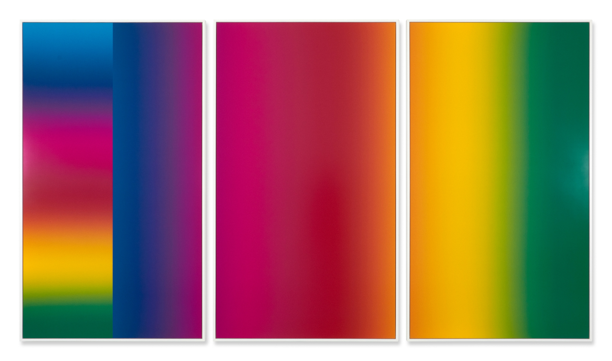 Photoshop CS: 84 by 144 inches, 300 DPI, RGB, square pixels, default gradient ''Spectrum'', mousedown y=10000 x=960, mouseup y=10000 x=40700; tool ''Wand'', select y=7600, x=4160, tolerance=64, contiguous=off; default gradient ''Spectrum'', mousedown y=10, 2015 Impression à développement chromogène, 2015