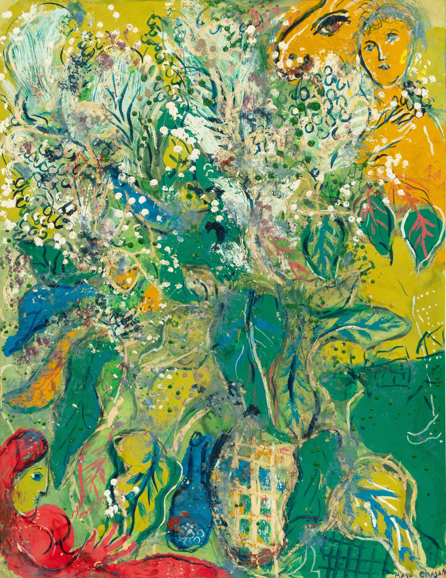 Fleurs et figures ou Bouquet en vert avec femme et chèvre jaune, 1956