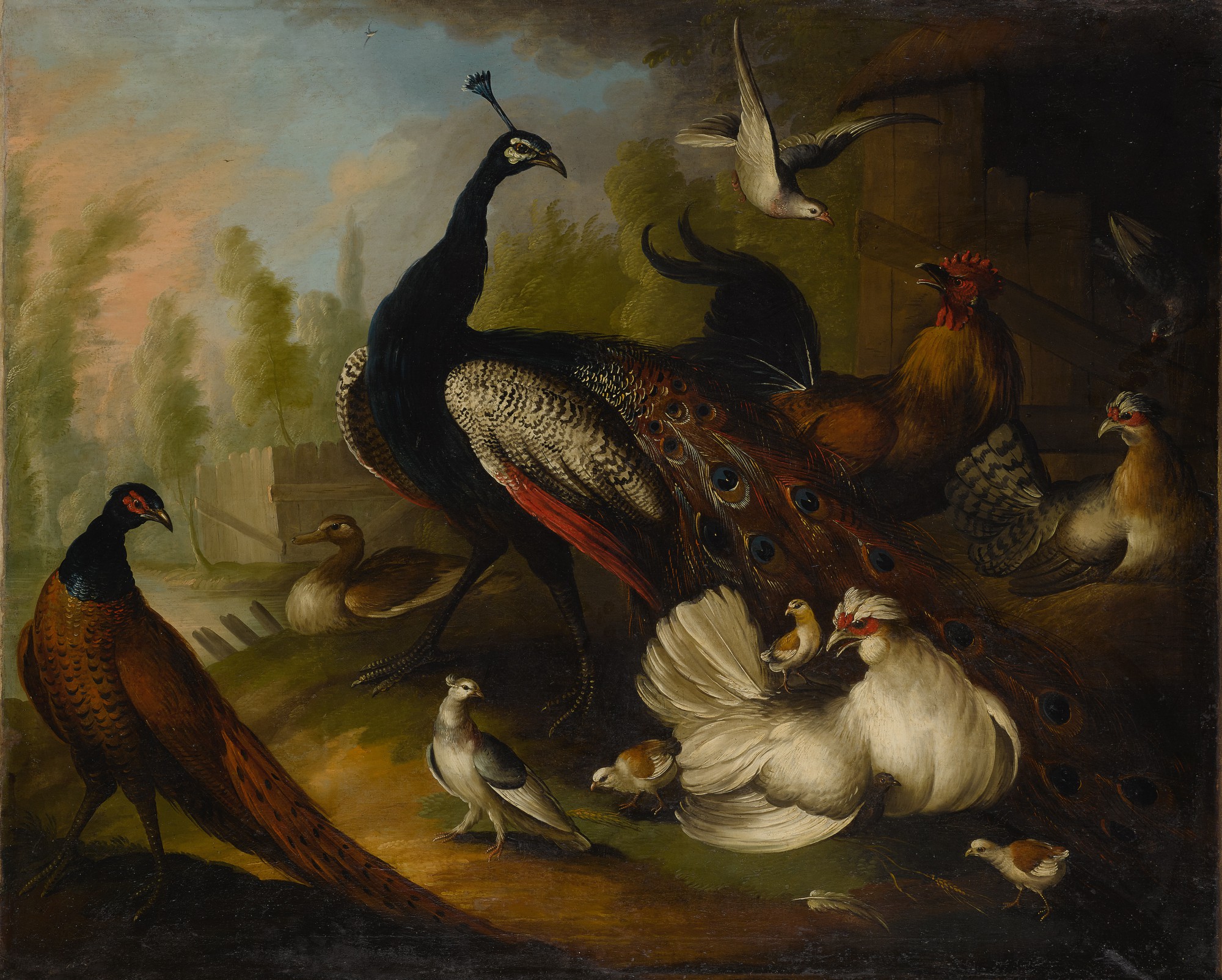 An assembly of birds in a parkland landscape, including a blue peacock, a pair of domestic crested ducks, a barbary coast duck, a red crested cockatoo, a yellow-headed Amazonian parrot, a great curassow, a white Muscovy duck, an Australian king parrot, guinea fowl, and turtle doves