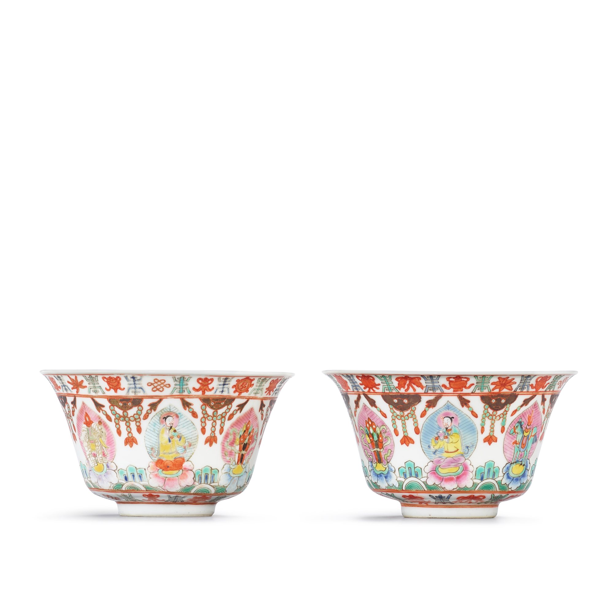 A pair of famille-rose 'baragon tumed' bowls, Qing dynasty, Daoguang period 清道光 粉彩七政寶盌一對 礬紅蒙文款