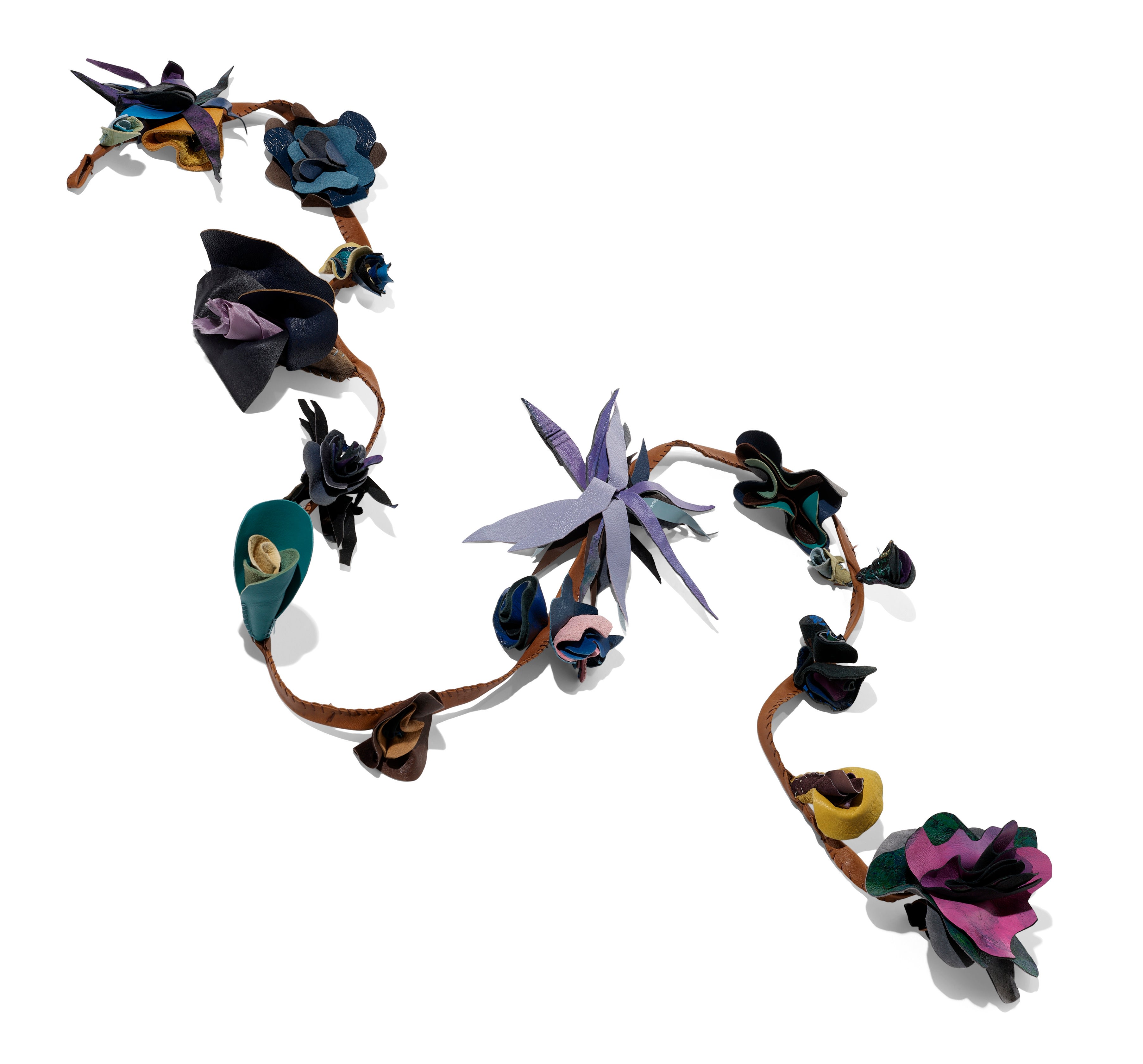 The North American artists working in this vein bring their own distinct preoccupations. Chakaia Booker has spent decades building dense, wall mounted sculptures from sliced and twisted rubber tires, creating forms that pulse with bodily energy and carry the weight of industrial labor and race in America. Tony Cragg, the British sculptor who won the Turner Prize in 1988, spent much of the 1970s and 1980s arranging fragments of colored plastic into silhouettes on gallery floors, works that looked archaeological, as if they were the fossils of a consumer civilization. Tau Lewis, the younger Canadian artist, works with found leather, synthetic hair, and salvaged textiles to build figural works that are simultaneously tender and confrontational, pulling questions of the Black body and ancestral memory through the language of assemblage.