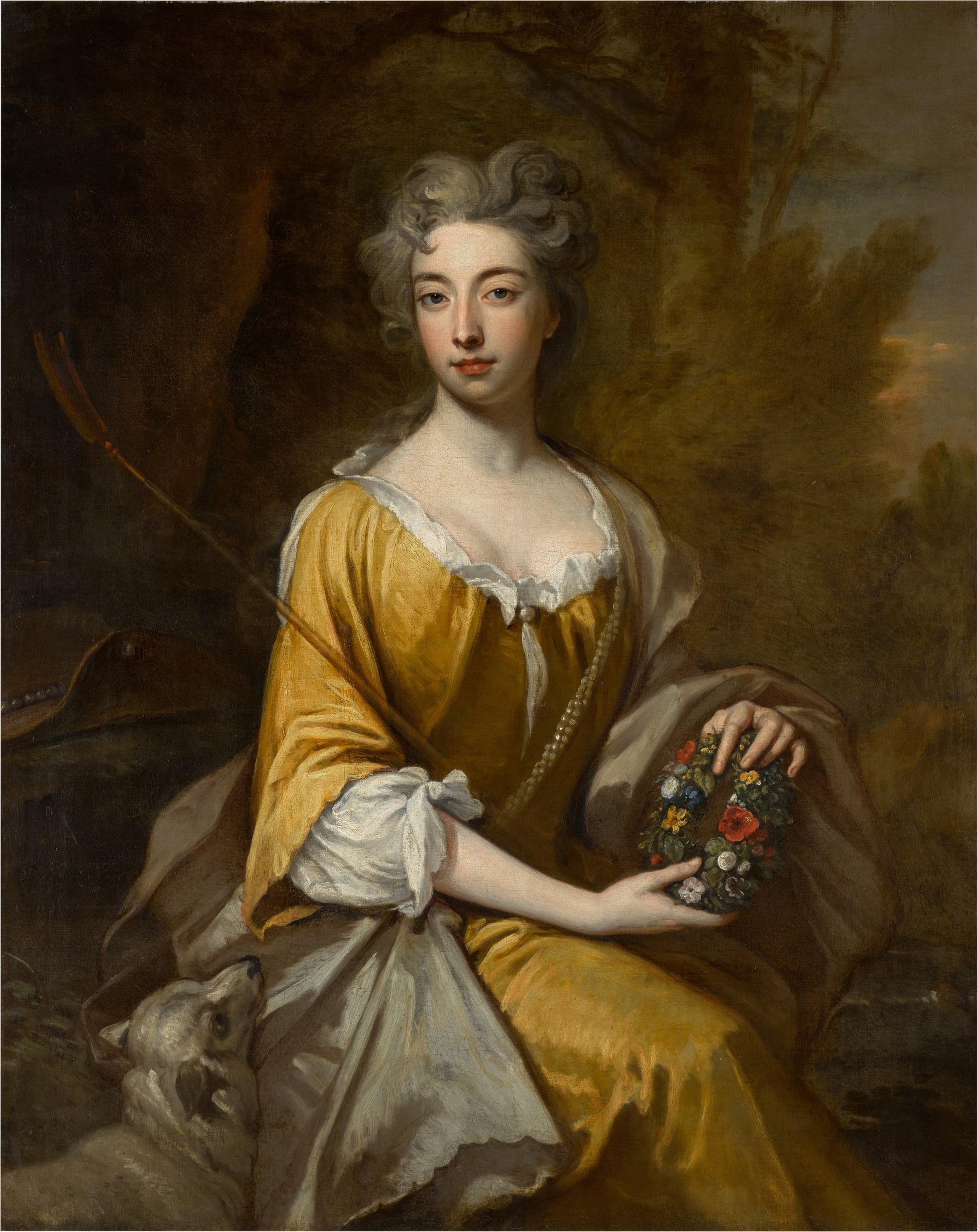 Portrait of Lady Elizabeth Cromwell (1674–1709), three-quarter-length, as a shepherdess seated in a landscape, holding a floral garland, a lamb by her side
