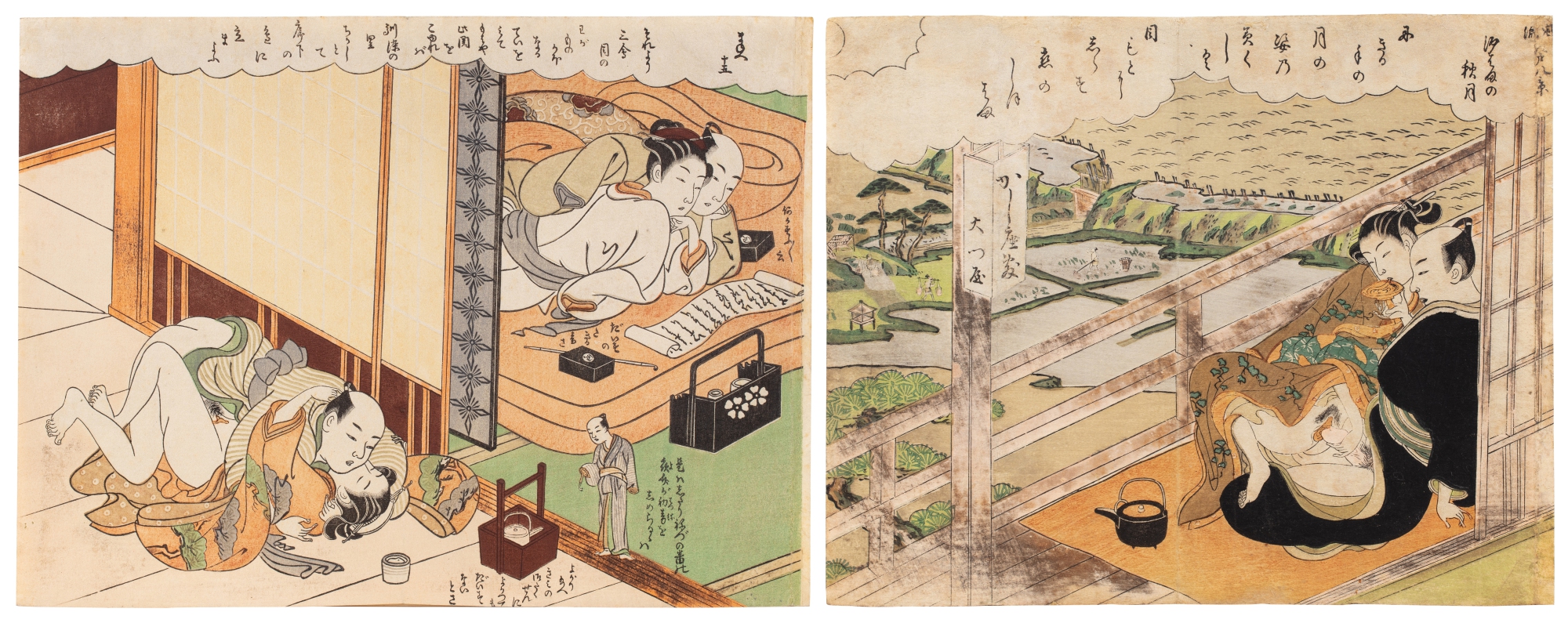 Attributed to Kitagawa Utamaro (1754-1806) An amorous couple beside folding screen and sewing box, Edo period, late 18th - early 19th century