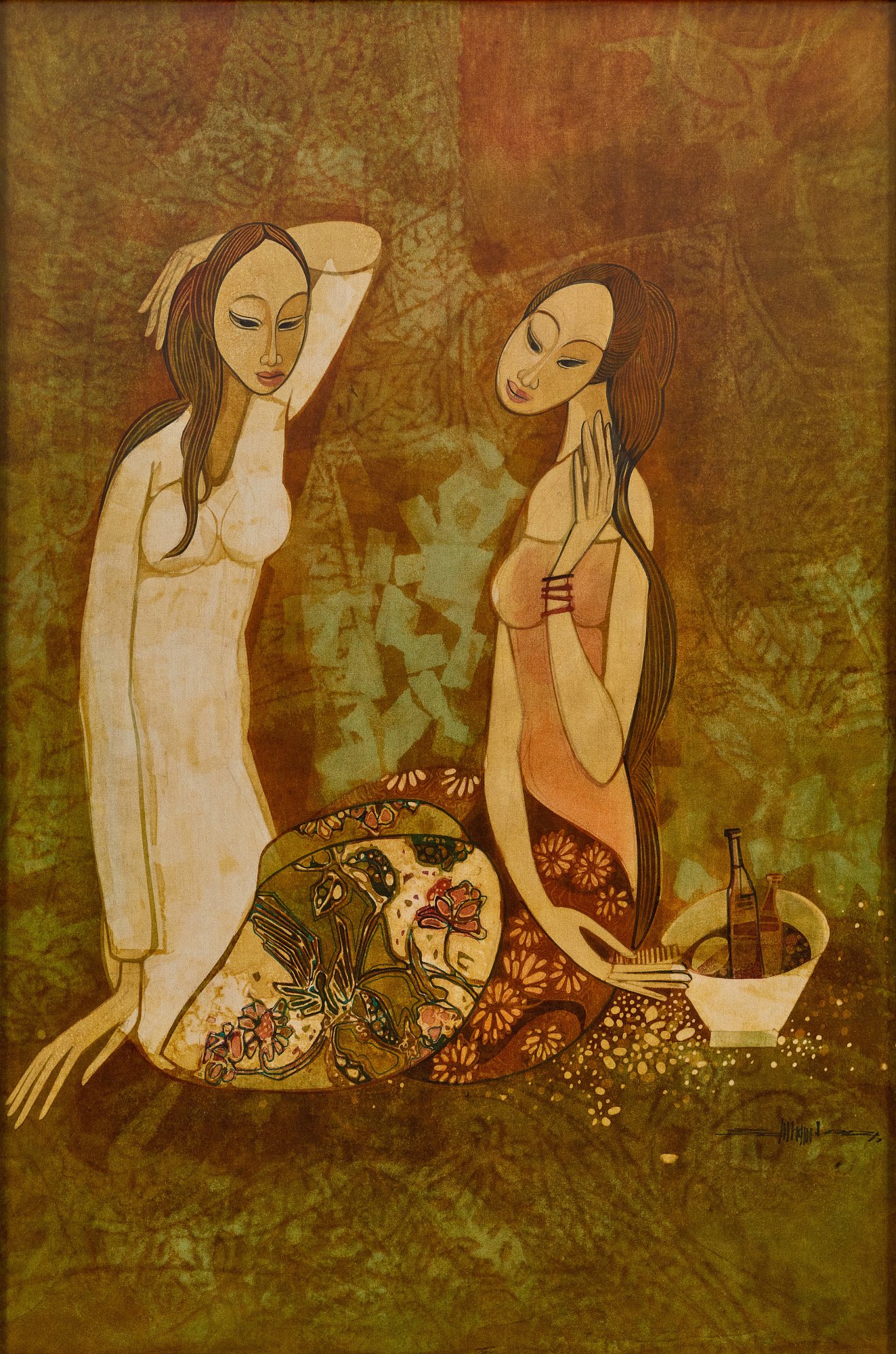 The works produced from that journey showed artists genuinely absorbed by a Southeast Asian visual world rather than simply passing through it. Georgette Chen brought a different but equally international formation to the scene. Born in China and educated in Paris and New York, she taught at the Nanyang Academy of Fine Arts for over two decades and left a deep impression on generations of students. Her still lifes and portraits carry a refined Post Impressionist sensibility, though they are grounded in the textures and tones of a life lived in the tropics.
