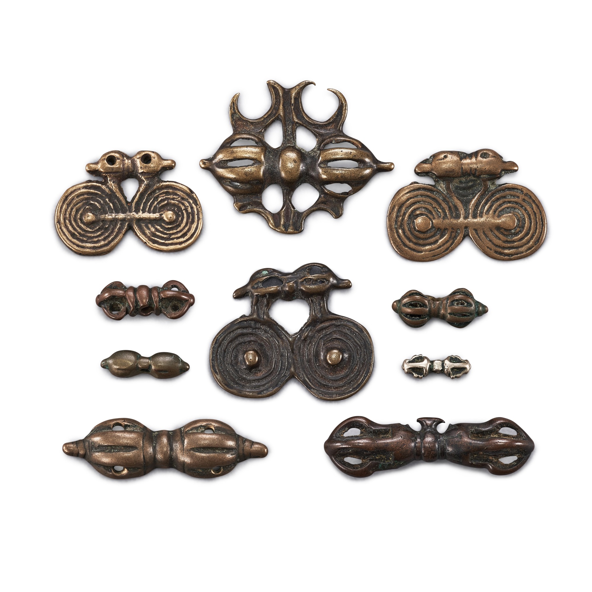 A group of 10 copper-alloy 'vajra' and 'spiral energy whirls' thogchags,