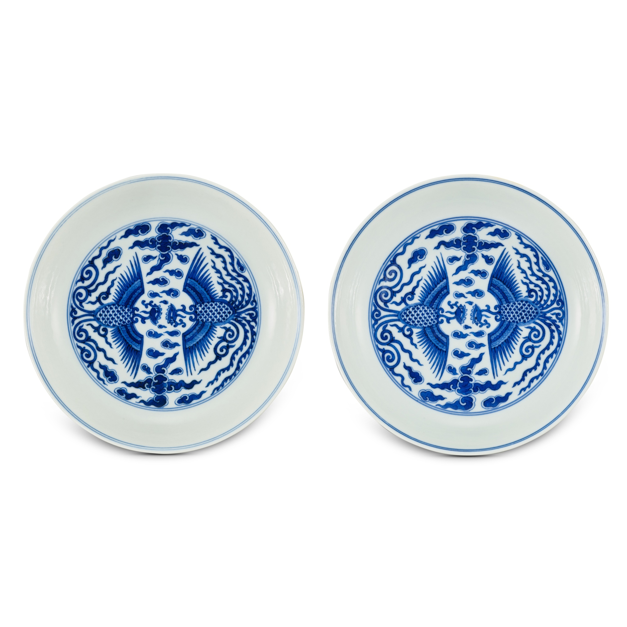 A pair of blue and white 'phoenix' dishes, Marks and period of Tongzhi 清同治 青花雙鳳紋盤一對 《大清同治年製》款