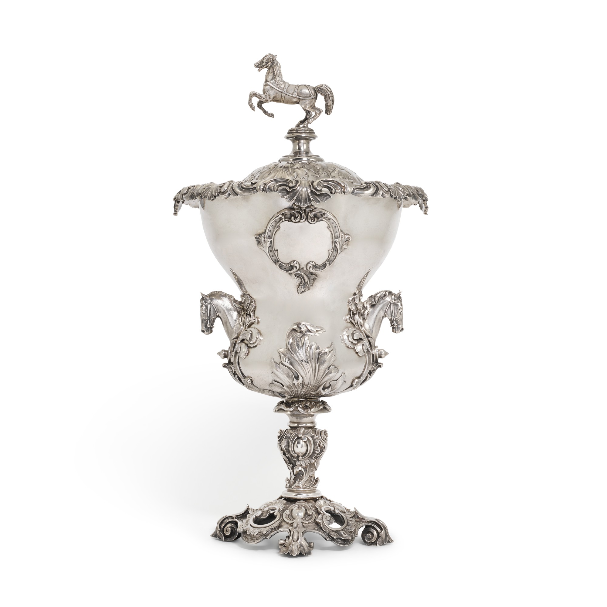 A silver equestrian-themed parcel-gilt trophy with cover, Sazikov, St Petersburg, circa 1880-1890